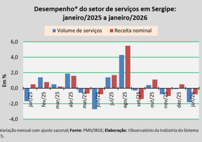 Em janeiro, o volume de serviços prestados em Sergipe reduziu 1,8%